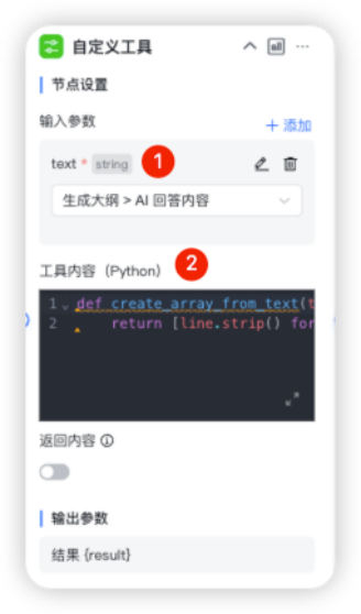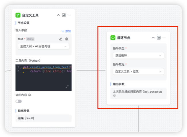 接下来要逐段扩写,得把大纲拆成一个个小部分,所以要加个自定义工具。在左边组件库找【自定义工具】,拖到【生成大纲】节点后面。