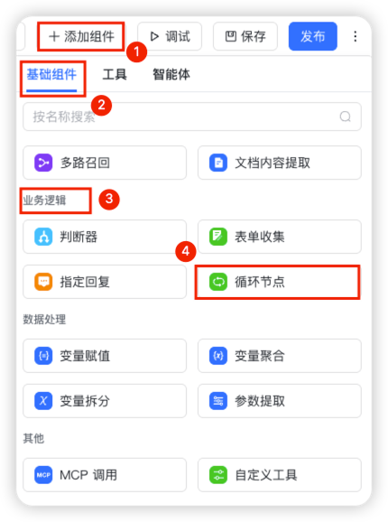 1. 在左边组件库找【循环节点】,拖到自定义工具后面。
