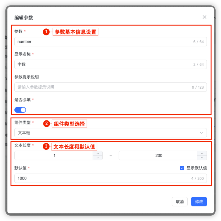 2. 可以设置默认值(比如字数默认1000),还能加提示说明(比如“请输入具体数字,如1500”)。