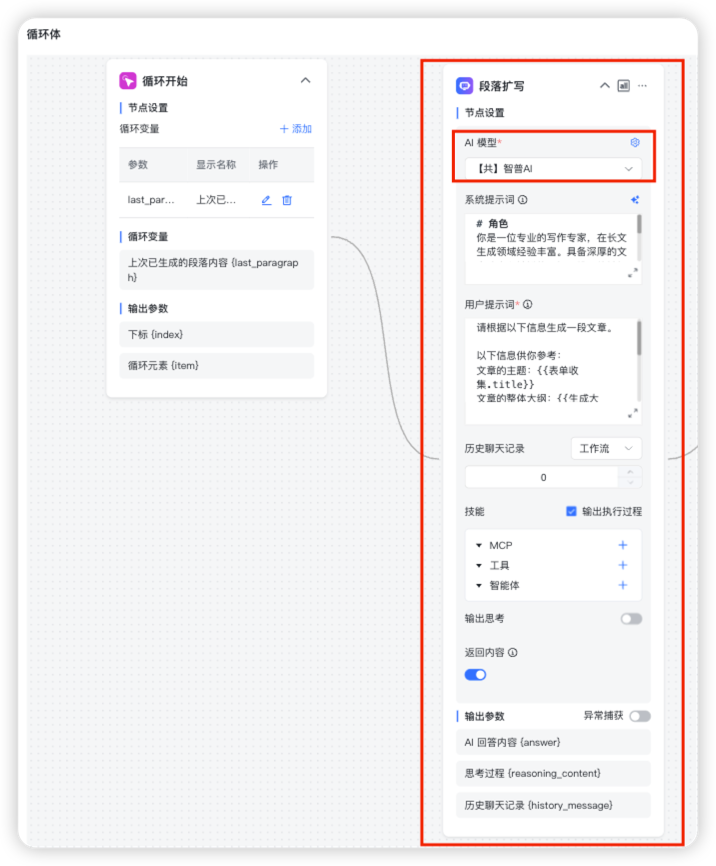 大模型一次写不了太长的内容,所以需要用循环节点,把大纲里的每个部分挨个扩写,最后拼起来。设置方法: