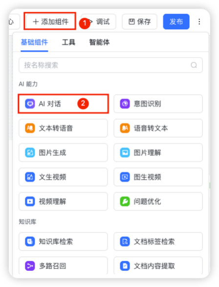在右上角【添加组件】中找到【 AI 对话】组件。