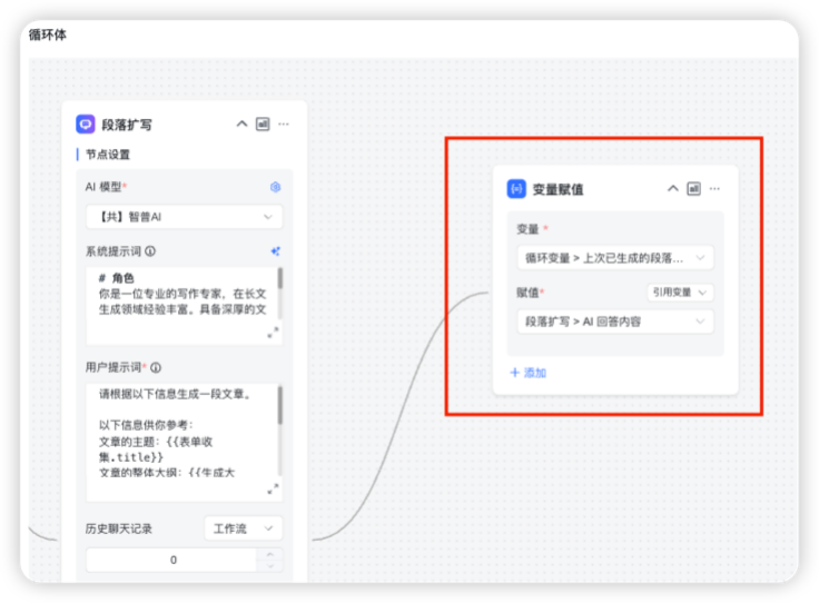 为了让每一段都能接上上一段的内容,使用【变量赋值】节点并进行设置。