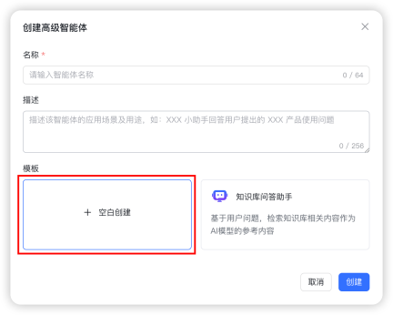 3. 模板选择:选【空白创建】!另一个【知识库问答助手】有预设节点,咱们要自定义流程,空白模板最干净,没多余干扰。
