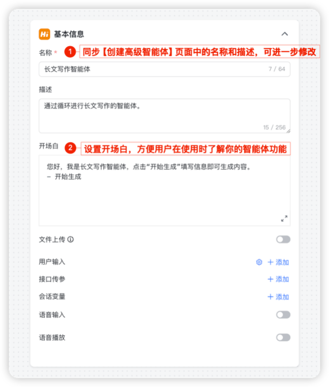 2. 开场白:这是用户打开智能体后第一眼看到的内容,需要描述清楚功能和操作方式。参考模板:“哈喽~ 我是[你的智能体名称]!想快速写长文?点击下面的‘开始生成’,填完信息我就帮你搞定~” 记得把“开始生成”设成按钮,方便用户点击。