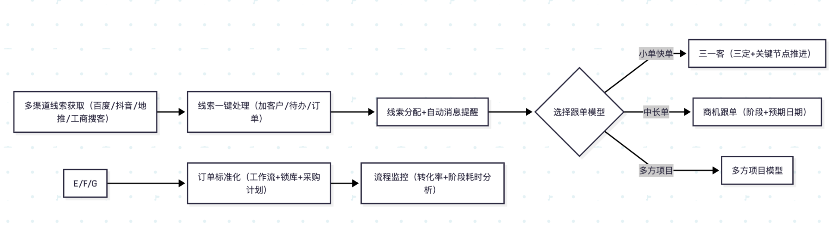 超兔一体云:聚焦中小企“多场景跟单”痛点,提供三大固定模型——小单快单用“三一客”(三定:定性、定级、定量+关键节点推进)、中长单用“商机跟单”(阶段+预期日期)、多方项目用“多方项目模型”。同时支持订单工作流标准化(锁库、采购计划、供应商直发),流程易落地,适合中小企快速复制高效动作。