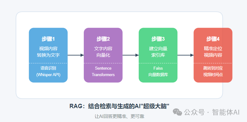 现在轮到你提问了!比如你输入“RAG怎么用在视频里?”,我们把这个问题也变成一个向量,然后去Faiss里找最相似的几个“画像”。找到后,它会告诉你对应的文字和时间戳。这就像在茫茫视频海里扔了个鱼钩,直接钓出你想要的那部分。
