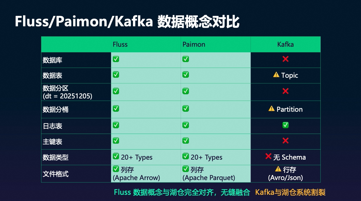 相比之下,Fluss 从一开始就按「面向数据湖 / 数仓」的方式进行对齐,支持数据库、表、分区、桶,以及变更日志、主键、更新语义等,使得在实施湖流一体时能够无缝融合,无需大量额外的适配逻辑。