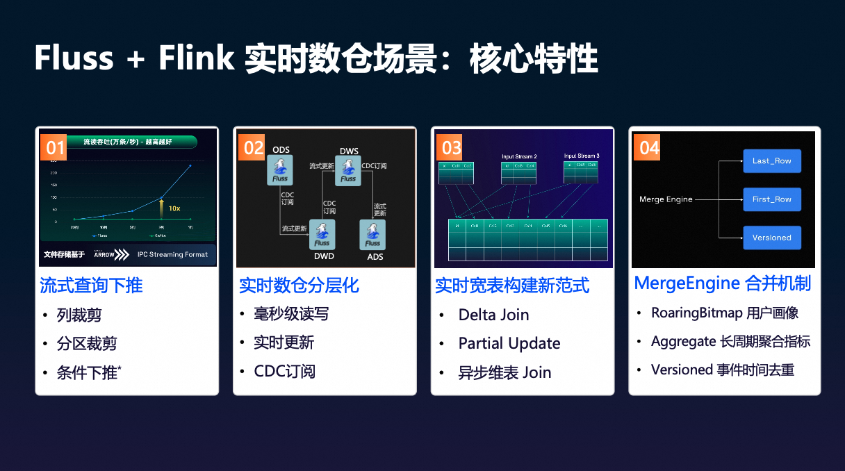 整体梳理下来,Fluss 与 Flink 配合用于实时数仓建设,主要具备四个核心特性。