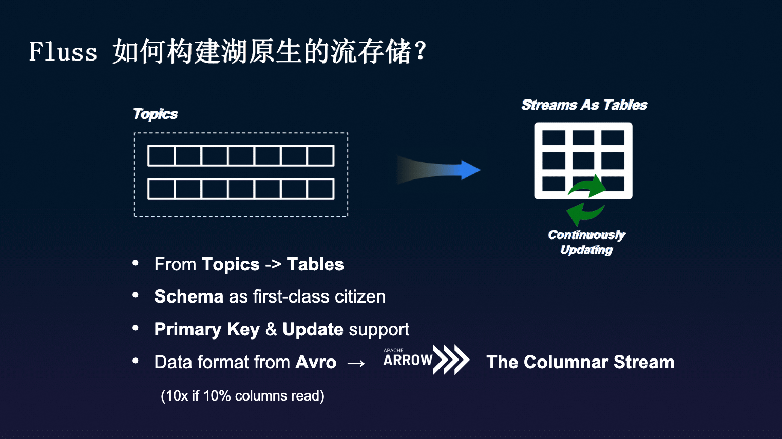 Fluss 基于 Apache Arrow 构建流式列存日志,不仅支持高效的列裁剪和条件下推,还能与 Lakehouse 的列式文件格式(如 Parquet、ORC)高效对接,极大降低 I/O 和计算开销。