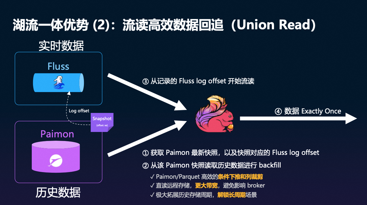这个 Offset 位点是实现 Union Read(统一读取)的关键——它确保了从 Lakehouse 读取的历史数据与从 Fluss 读取的实时数据之间严格的一致性边界,从而实现“不多一条、不少一条”的端到端 Exactly-Once 语义。