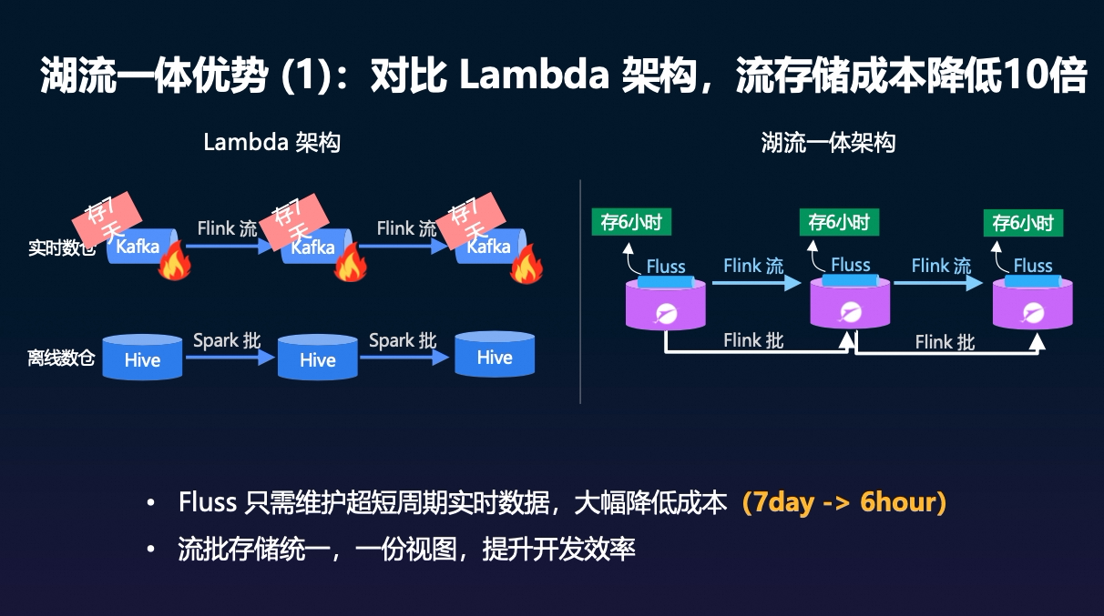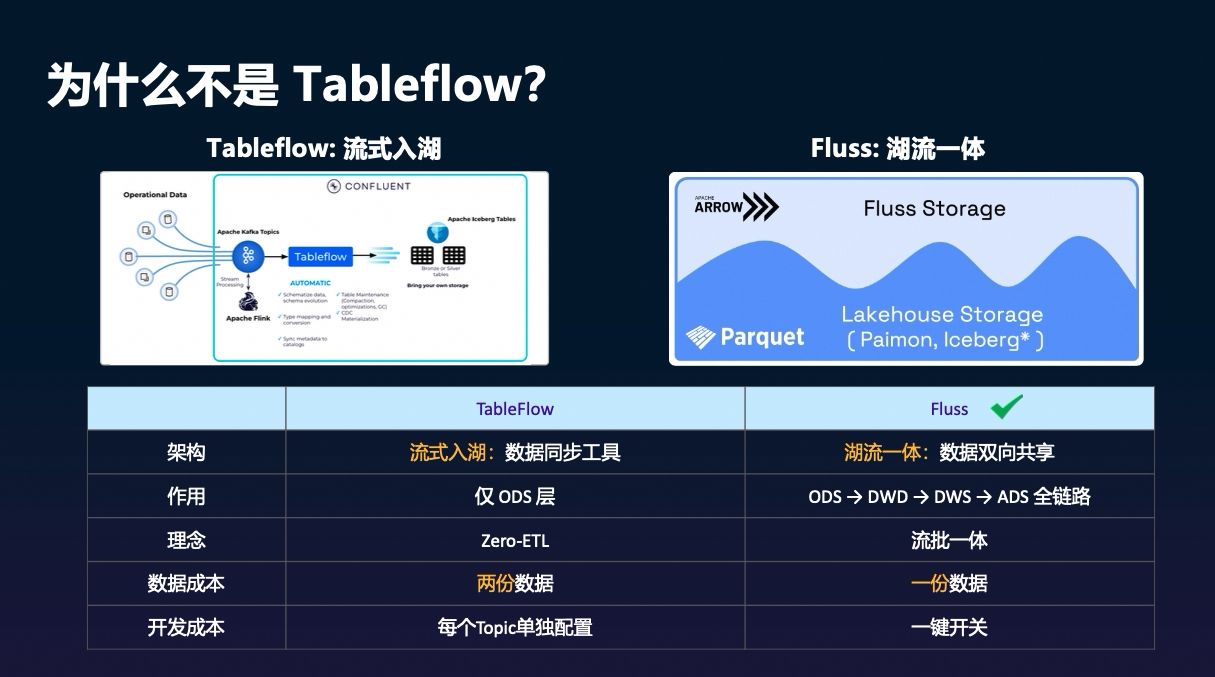 那这种「流到湖」的单向模式和 Fluss 的「湖流一体」之间,在架构理念和能力边界上有什么差异呢?