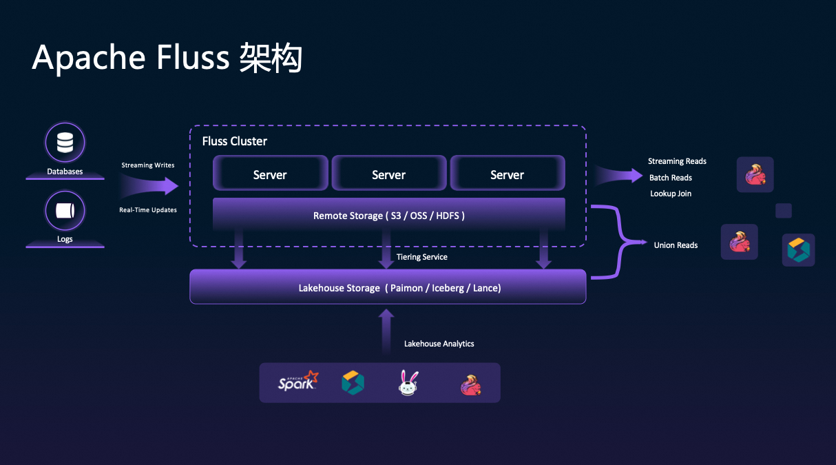 Fluss 内置一个名为 Tiering Service 的后台服务(当前基于 Flink 实现,未来可扩展至其他运行时),它会自动将开启了“湖流一体”特性的表数据,持续地从 Fluss 转换为 Paimon 等 Lakehouse 格式,并精确记录 Lakehouse 快照与 Fluss Log Offset 之间的对应关系。