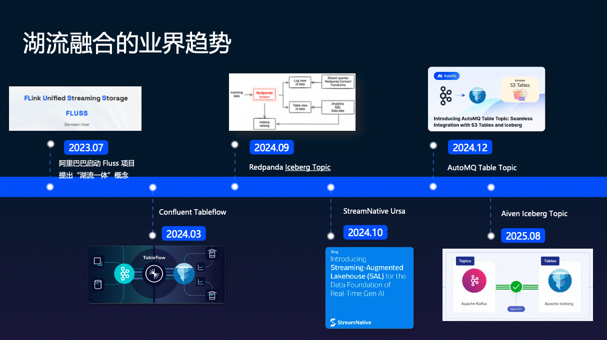 在展开介绍这个湖流一体架构之前,先简单聊一下业界在湖流融合方向上的一些趋势。这条路并不是只有我们在走,业界很多流存储厂商其实都在向这个方向演进。