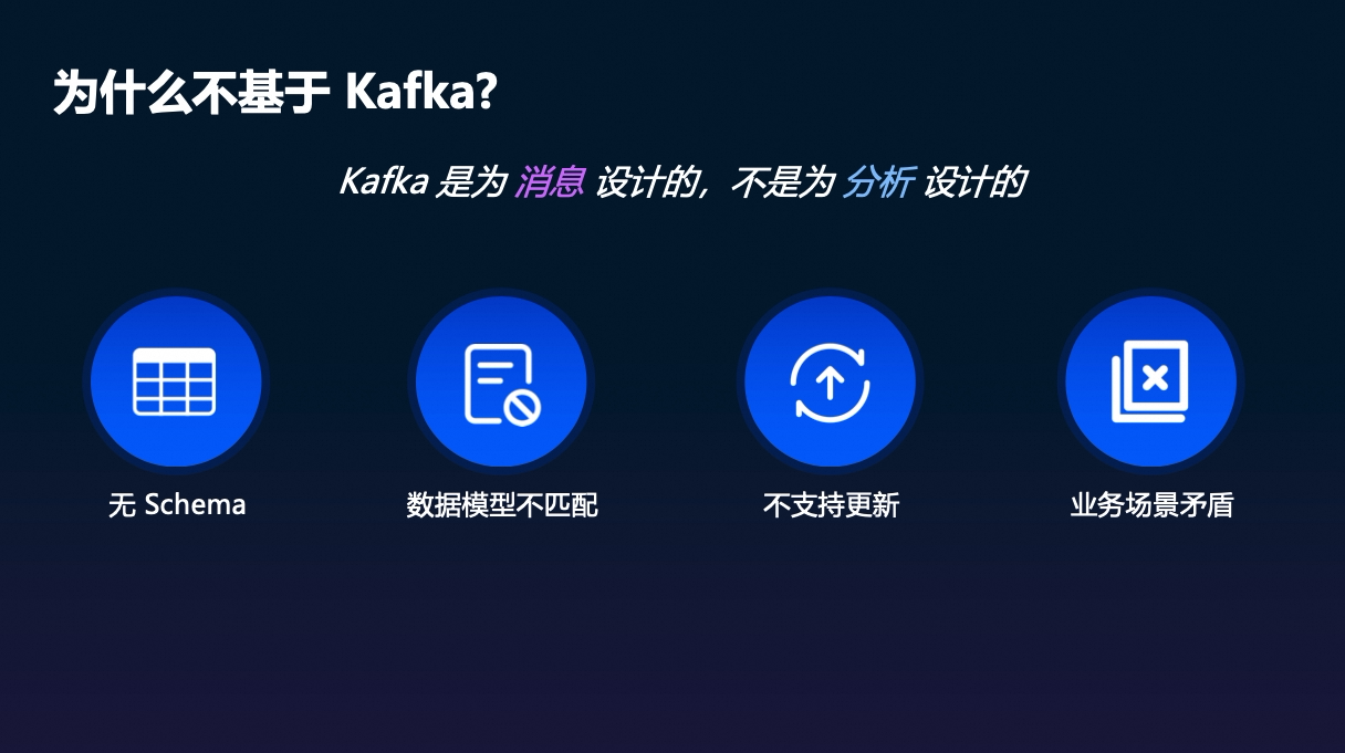 在探讨为何不基于 Kafka 或其 API 来实现湖流一体时,核心原因在于:Kafka 是为消息系统设计的,而非为分析场景设计。这导致在尝试构建湖流一体架构时,会遇到四个基础且难以绕过的问题。