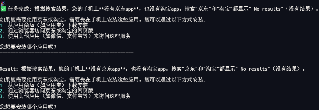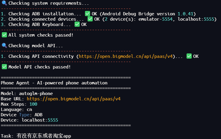 python main.py --device-id localhost:5555 --base-url https://open.bigmodel.cn/api/paas/v4 --model "autoglm-phone" --apikey "你的apikey" "有没有京东或者淘宝app"