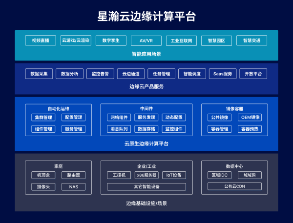 (星瀚云自研边缘计算平台架构图:平台通过“基础设施-平台能力-产品服务-智能场景”四层体系,实现从广泛终端接入到云原生边缘计算平台,再到上层智能应用的端到端贯通,支撑丰富的实时场景)