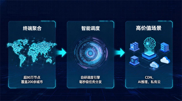 不同于传统重投入建机房的模式,星瀚云选择了一条更难但更可持续的路:激活社会闲置资源,让千家万户的终端成为数字基础设施的一部分。通过部署智能机顶盒、AI数智终端等边缘算力终端设备,公司已在全国聚合超80万个节点,构建起覆盖200余城市的分布式算力网络。这一“双轮驱动”模式,具体体现为“终端聚合—智能调度—场景服务”的三层架构:前端低成本整合小微场景的闲置带宽、算力与存储;中台依托自研调度引擎实现毫秒级任务分发;后端面向CDN、AI推理、私有云等高价值场景输出标准化服务。这一创新实践,正是‘以创新驱动未来’这一价值观,在商业模式上的核心体现。