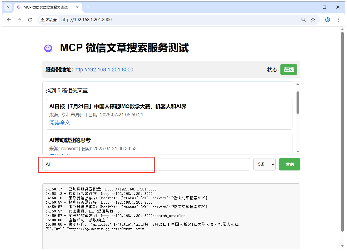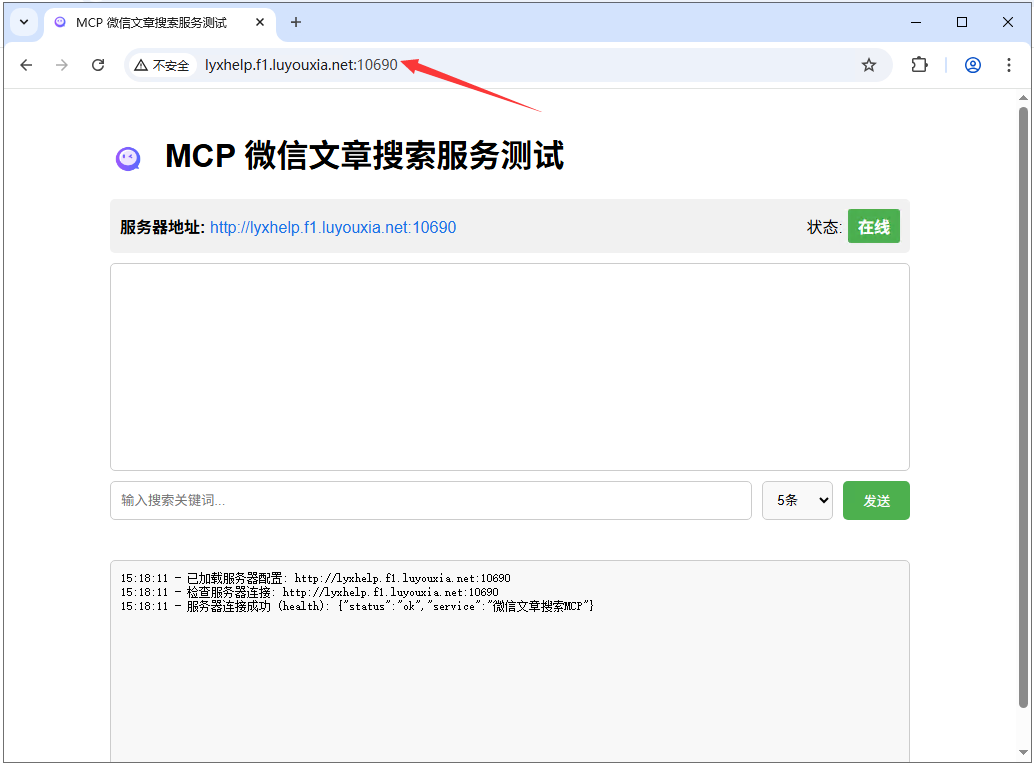 12,在外网电脑上,打开浏览器,在地址栏输入从路由侠生成的外网地址,就可以看到内网部署的 weixin_search_mcp 界面了。