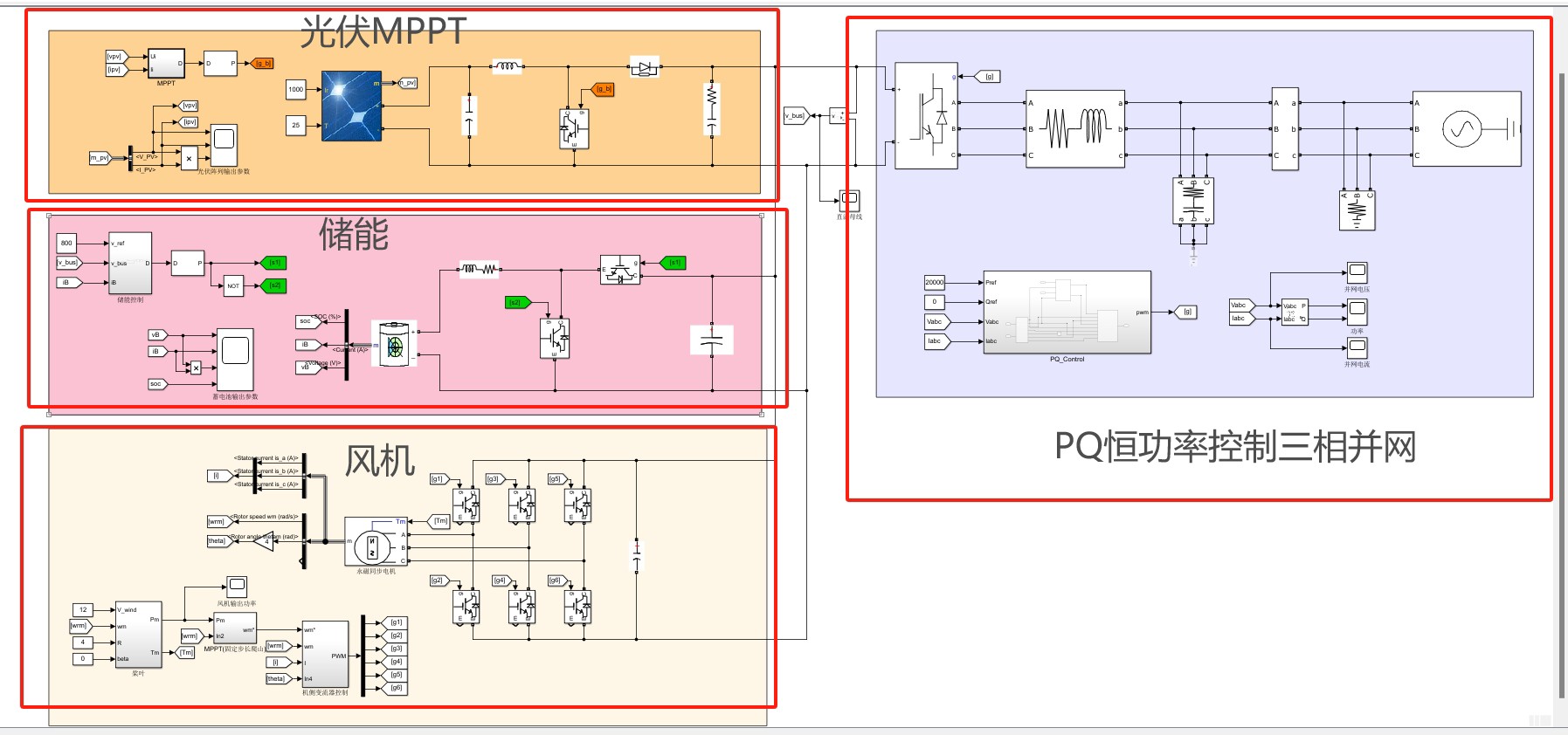 在现代能源系统中,风光储并网技术是一种重要的能量转换与储存方式。本文将介绍一种基于共直流母线的风光储并网系统仿真模型,并通过代码分析其各部分的工作原理和性能表现。