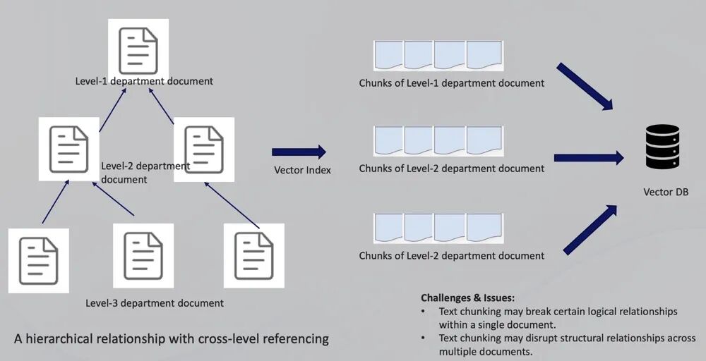 - 在向量数据库中,这些文档被切成 chunk 后是“平权”的,无法保留层级、来源和引用关系。