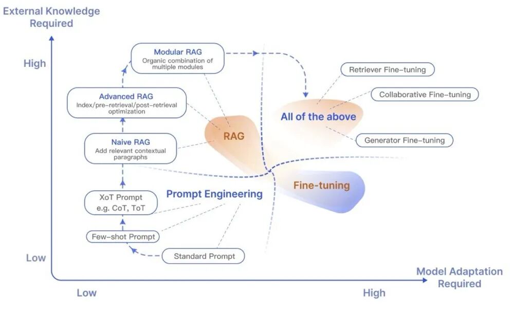 - 微调:成本高昂、流程复杂,文档的每次更新都可能触发重新训练