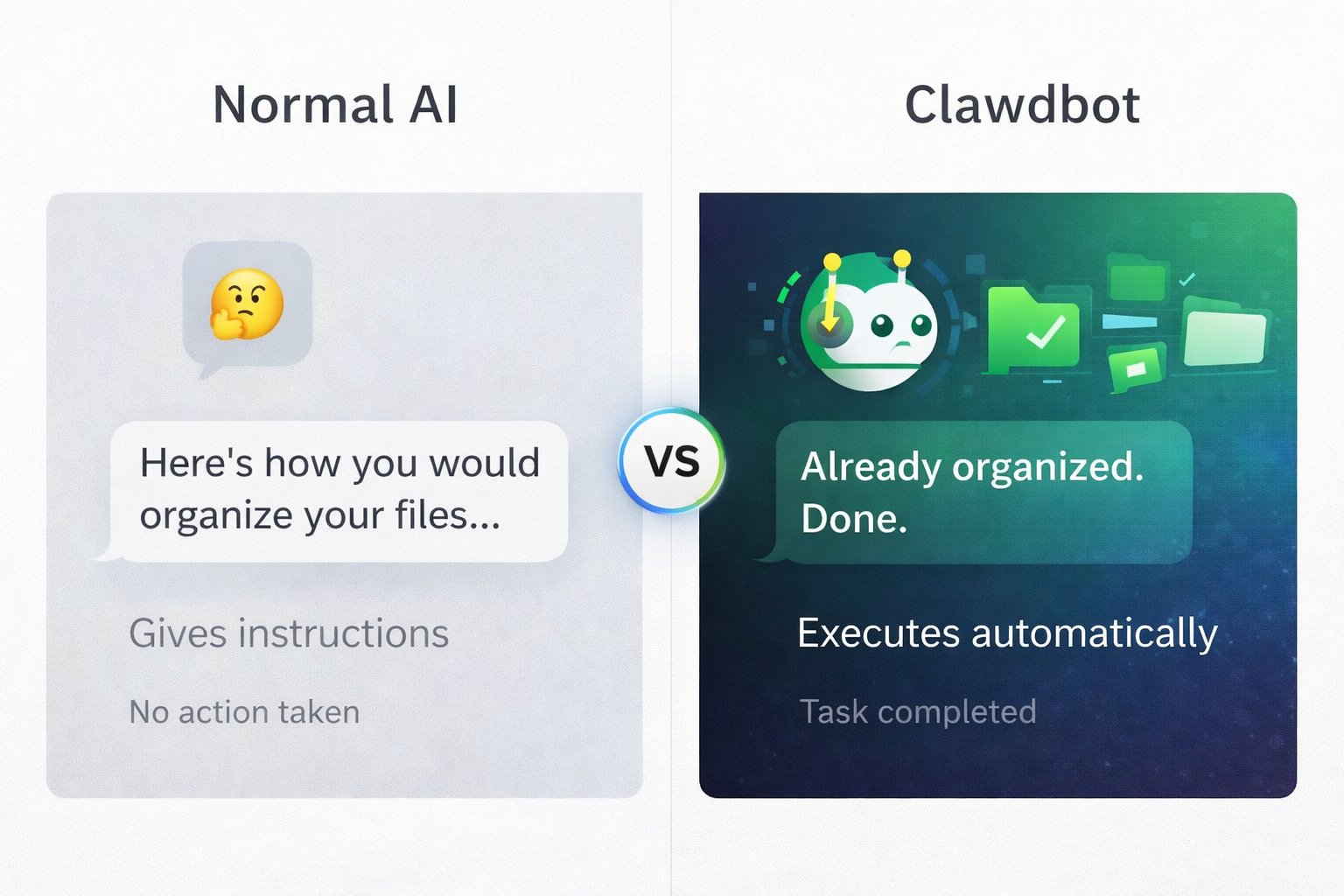 普通人工智能:“教你如何整理文件。”Clawdbot:“在你看如何整理文件时已经整理好了文件”