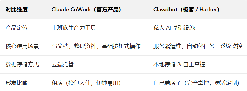 它独特的 Pairing 机制,确保只有你授权的账号能访问 AI,陌生请求默认拒绝。对重视隐私、资产安全的用户(尤其是加密圈),这点非常致命。Clawdbot 与 Claude Cowork——核心区别是什么?X 上有一个非常贴切的比喻,被大量引用: