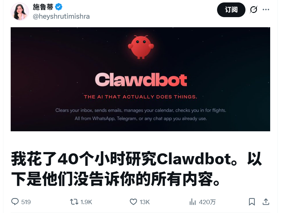 在刚刚过去的 四天时间里,如果你还沉浸在 Claude Code、Skill、Agent 工作流的讨论中,那你很可能错过了一个现象级的名字:Clawdbot。在 X(Twitter)上,它被大量海外 AI 博主称为:「迄今为止最伟大的 AI 应用」