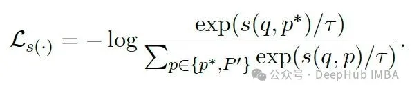 损失函数采用 InfoNCE,灵感来自 M3-Embedding 论文(arxiv:2402.03216)。公式中 p* 是正样本嵌入,P’ 是负样本嵌入列表,q 是查询嵌入,s(.) 表示相似度函数,比如余弦相似度。