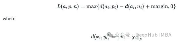 损失函数是 Triplet Margin Loss。公式里 a 代表锚文本嵌入,p 代表正样本嵌入,n 代表负样本嵌入。