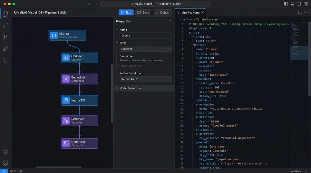 系统内置的 Pipeline Builder 支持“画布构建”与“代码编辑”的双向实时同步。你可以在可视化画布上拖拽节点、连接流程,系统会自动生成对应的 YAML 配置;反过来,你也可以直接编辑代码,画布会实时更新显示。这种所见即所得的开发体验,让复杂的 RAG 流程设计变得直观而高效。