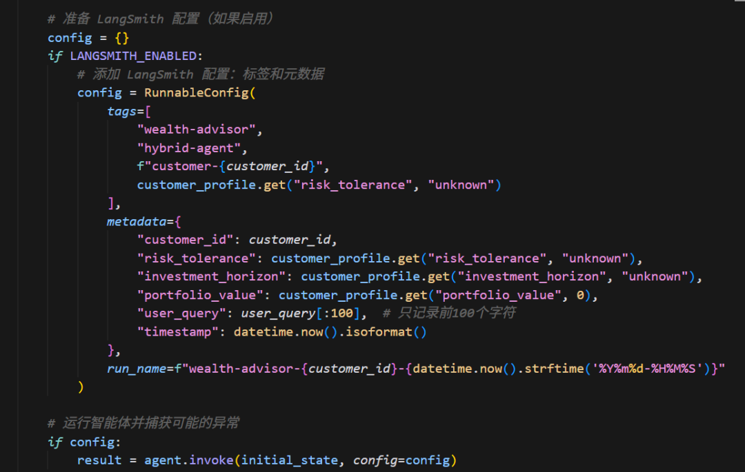Step3,自动追踪配置,代码中配置config的标签及元数据,通过tags 和metadata 为每次运行打上标签(如用户ID、业务类型),方便在LangSmith后台进行筛选、 分组和故障排查。