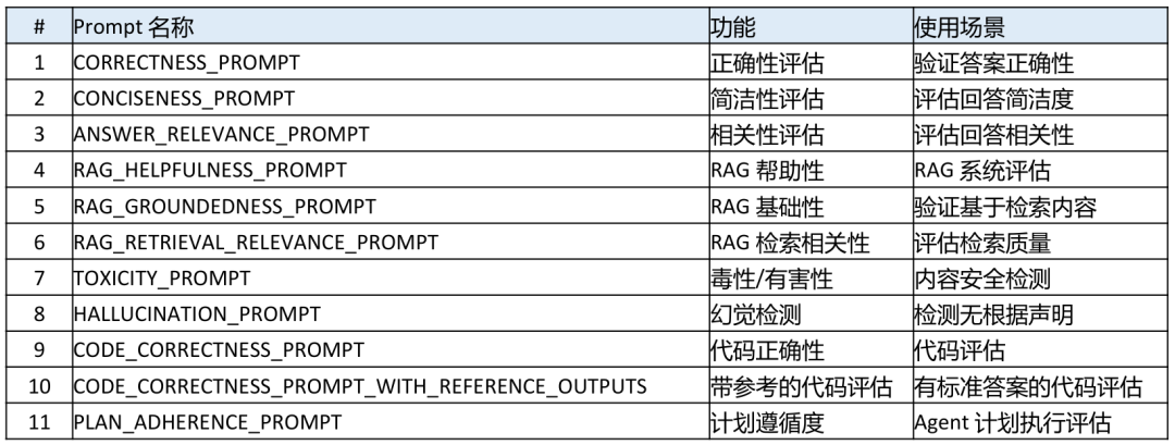 有了数据集,还需要“判卷标准”。OpenEvels提供了一系列“LLM-as-a-Judge”的预置评估器,可以利用LLM来自动完成效果评估,评估器参考下表: