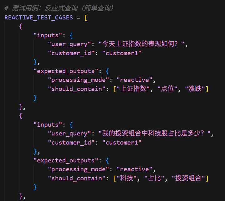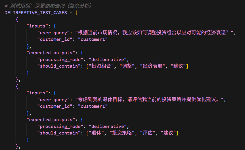 - 深思熟虑场景(复杂分析):例如“如何调整组合应对衰退?”。预期输出应包含“投资组合”、“调整建议”等核心逻辑 。