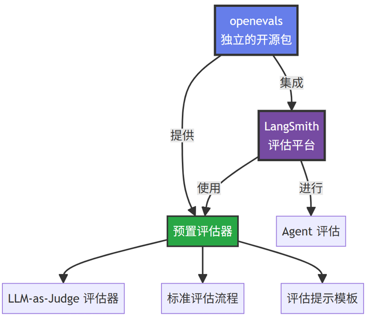 对于复杂的Agent,我们不能指望每天手动测试几百遍,我们需要一套自动化的打分系统。OpenEvals是一个独立的开源评估器库,由LangSmith团队开发,它相当于是LangSmith的一个插件,LangSmith 提供评估的平台和基础设施,LangSmith可以通过openevals,调用多种内置评估器,openevals 的评估器可以在LangSmith中使用。