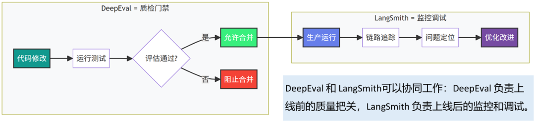 DeepEval一个开源的LLM 评估框架,专注于对大语言模型应用进行系统化的质量测试和评估,为LLM 应用提供了标准化的测试能力。DeepEval内置40+评估指标,覆盖RAG、Agent、对话等多种场景,包括幻觉检测、相关性、忠实度等。DeepEval和LangSmith可以协同工作:DeepEval负责上线前的质量把关,LangSmith 负责上线后的监控和调试。
