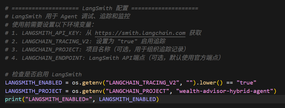 LANGCHAIN_PROJECT=“wealth-advisor-hybrid-agent” # 可选,用于组织追踪记录