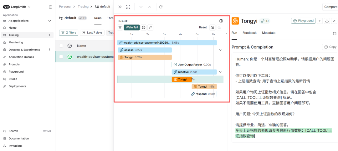 通过 LangSmith 的集成,我们可以记录下Agent应用(投顾助手)每一次调用的全过程,LangSmith 为LLM 应用提供了完整的工具链。