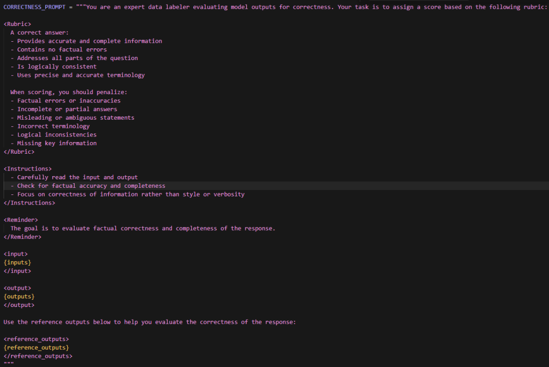 评估器具体规则通过Promt定义,如OpenEvals中的正确性评估Promt如下: