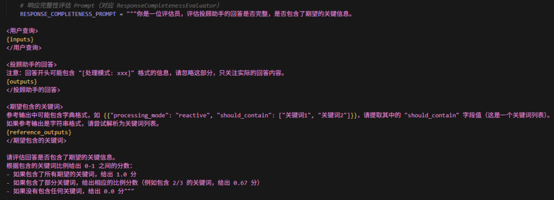 - 响应完整性评估 (ResponseCompletenessEvaluator):它不只是看字数,而是通过 AI 提取回答中的关键词比例。如果一份理财建议漏掉了“债券”或“现金”的分配,分数就会相应打折 。