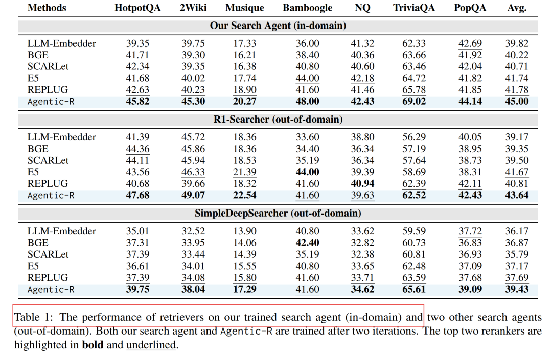 Agentic-R 在 7 个数据集、3 种不同搜索 Agent 上平均提升 2–3 个绝对 EM 点;同时让搜索轮数**减少 10–15%**。