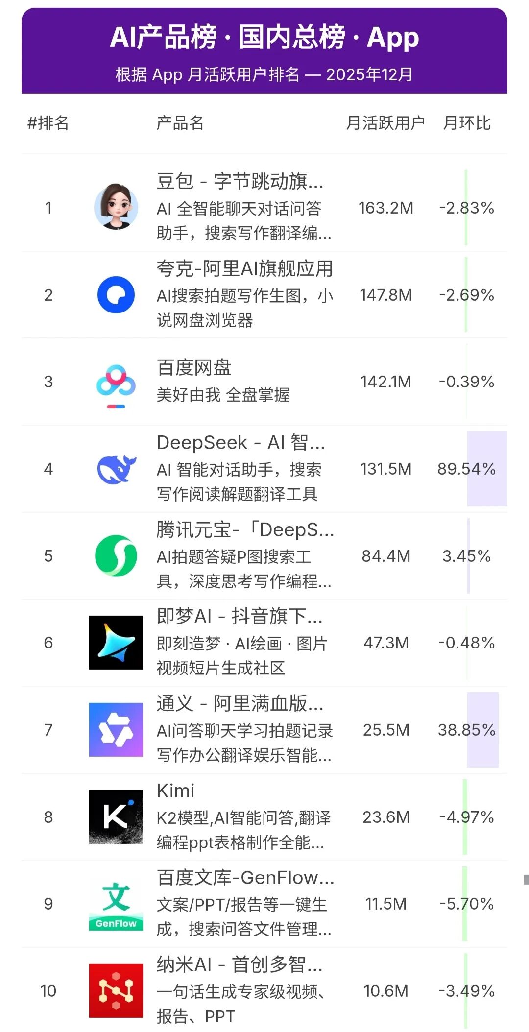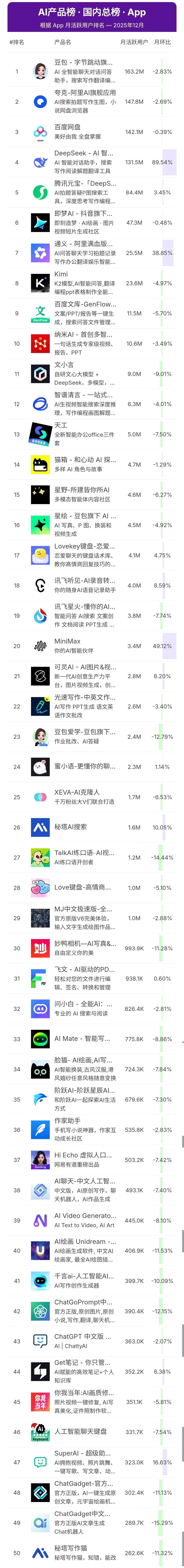 根据AI产品榜2025年12月APP应用端AI大模型访问量TOP10排名如下