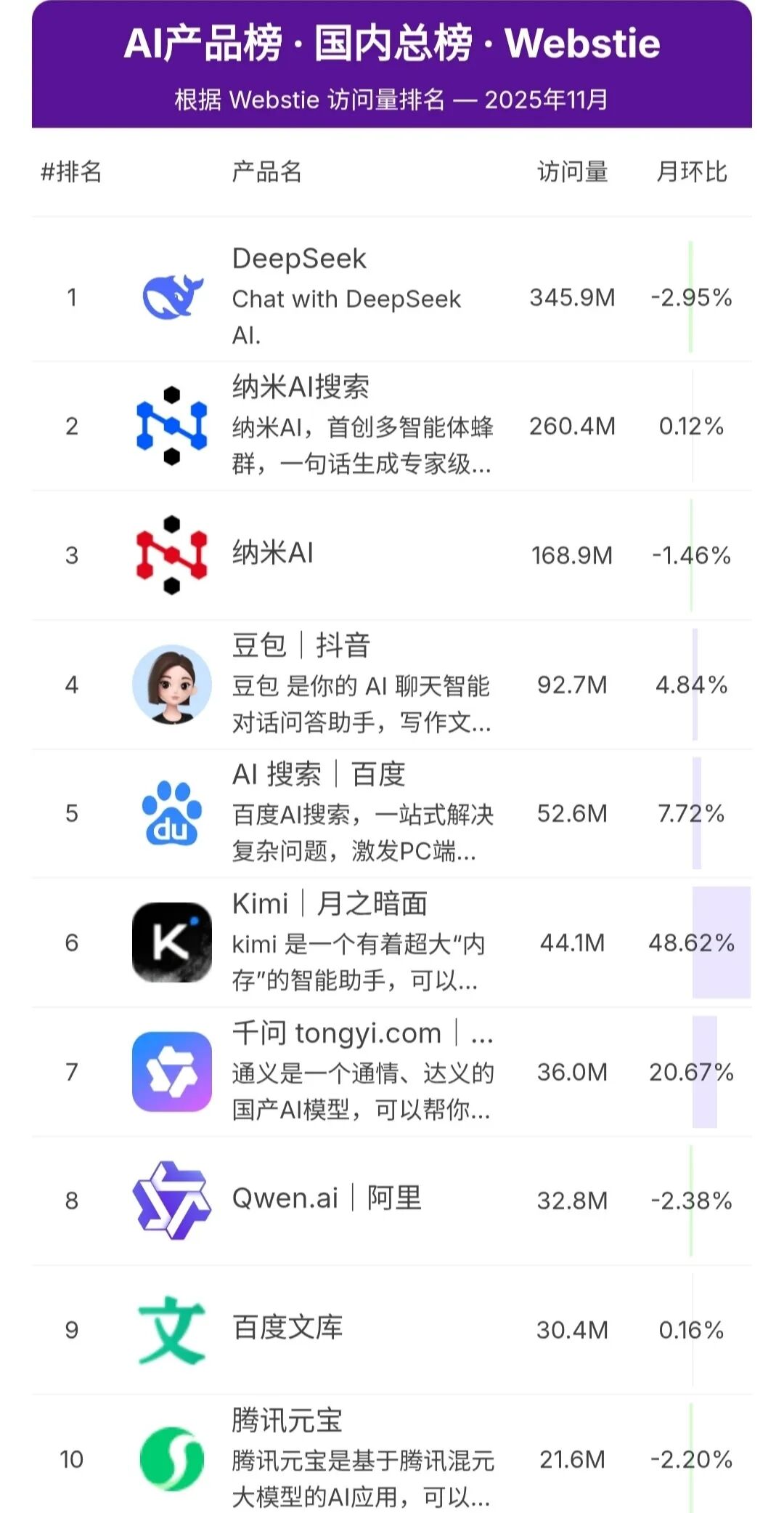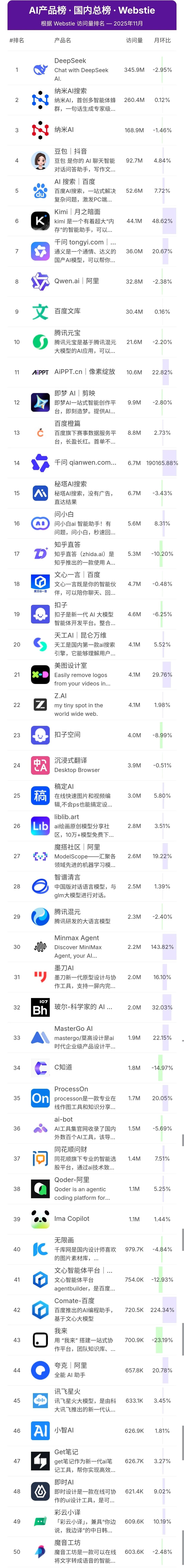 根据AI产品榜2025年11月网站端AI大模型访问量TOP10排名如下