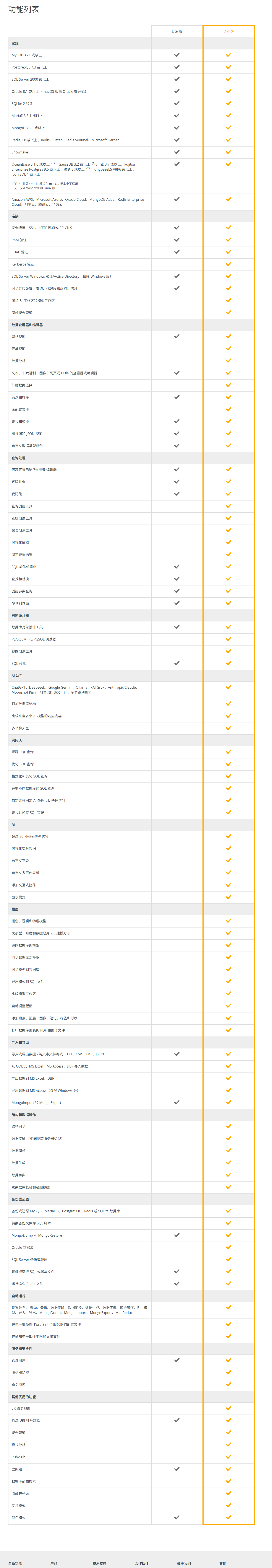 | AI 助手 | ❌ 完全不支持 | ✅ 内置 Navicat AI 助手,支持 SQL 生成、查询优化、错误解释等能力 |