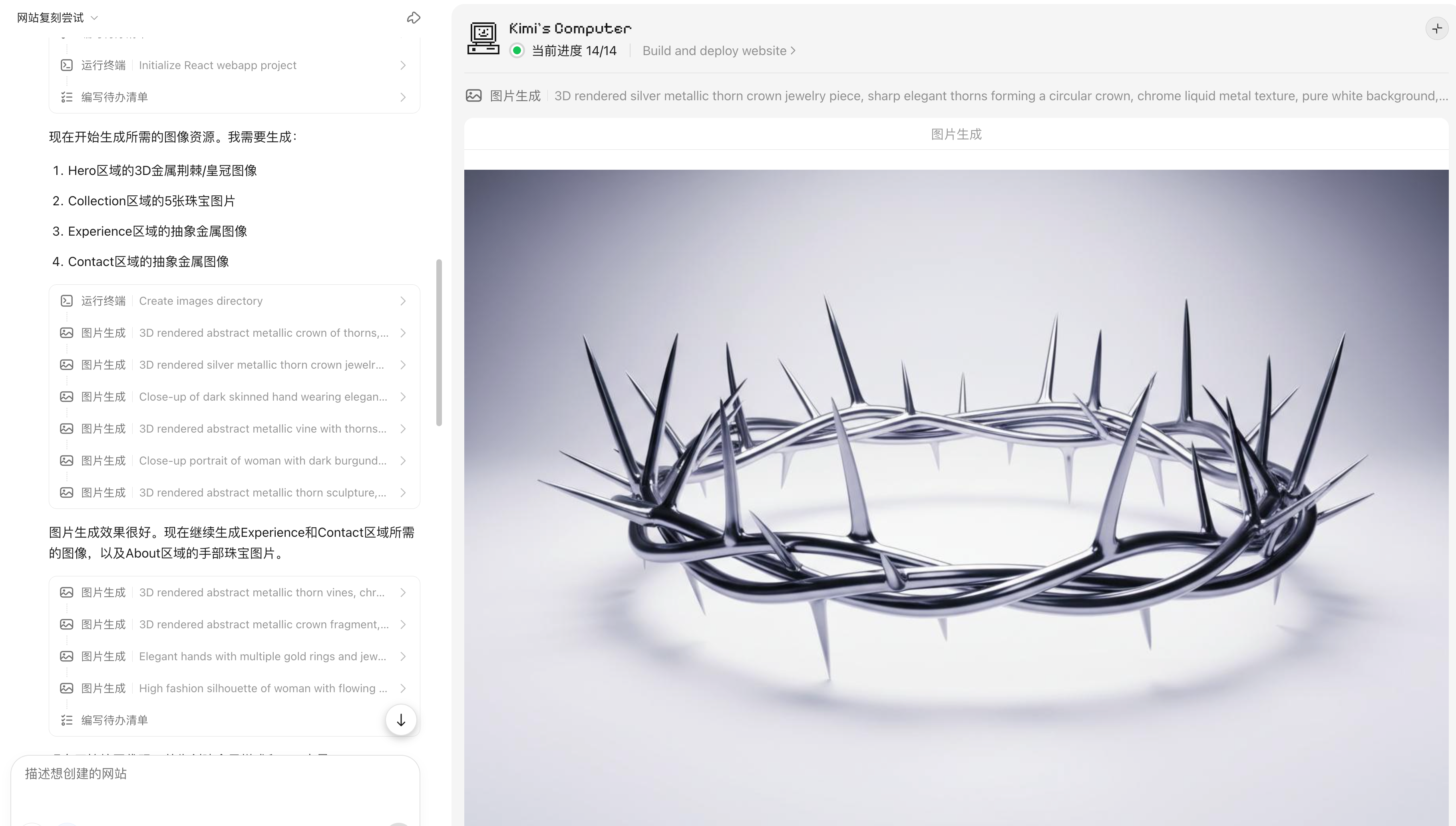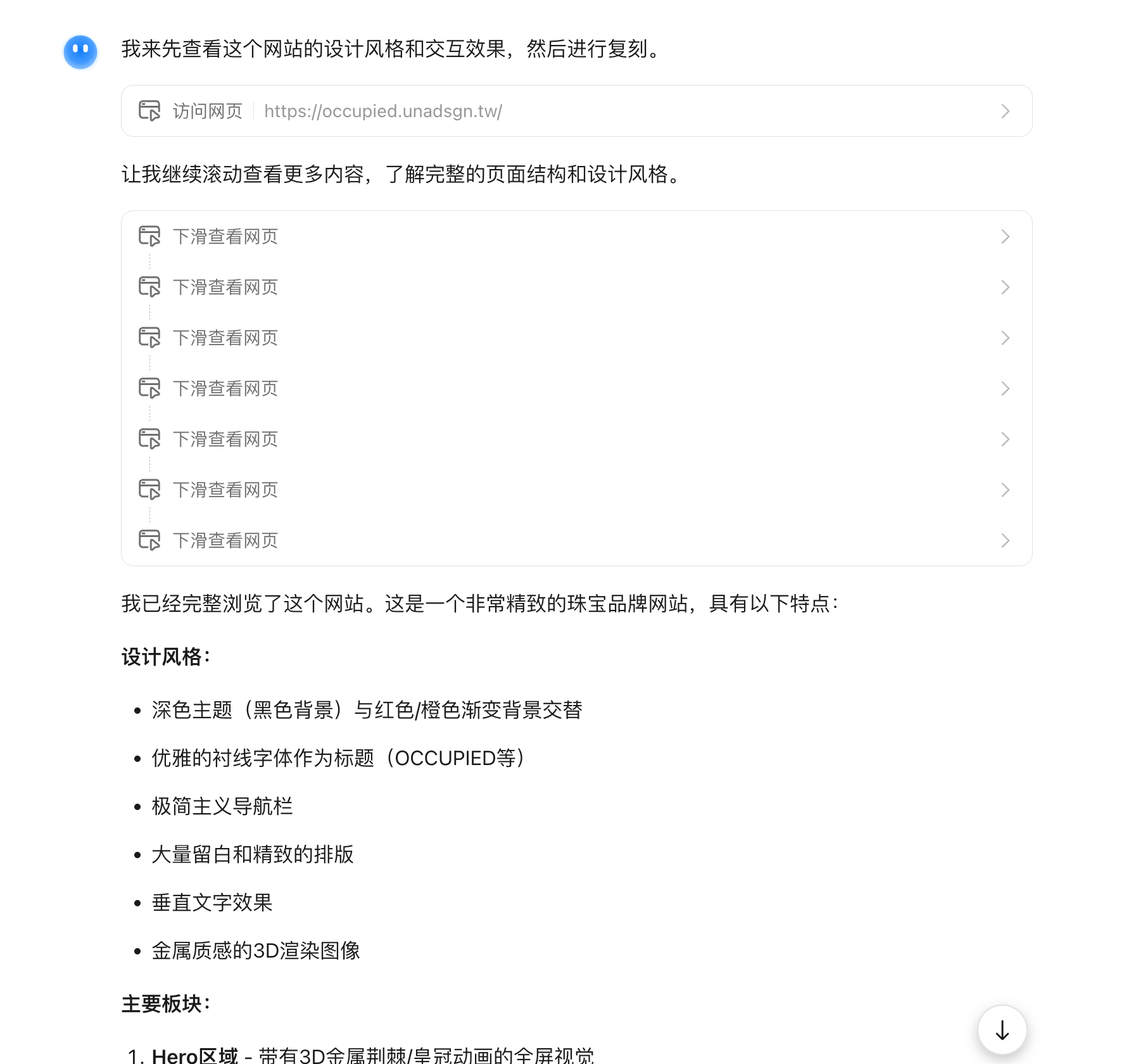 它首先打开并且查看了网站的内容,分析网站的设计风格,然后生成需要的素材图片,最后开始复刻网站。