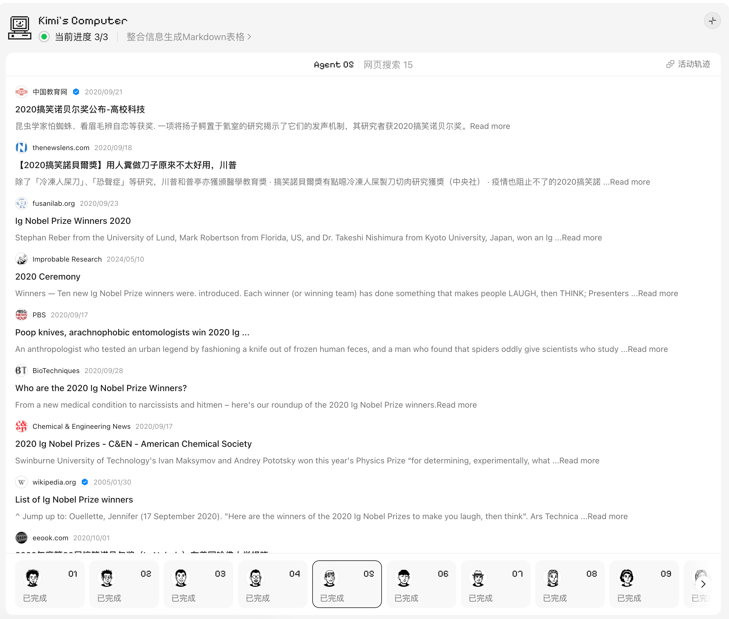 现在 Kimi 瞬间理解了批量意图,后台自动拆分任务去查资料,然后汇总给我。