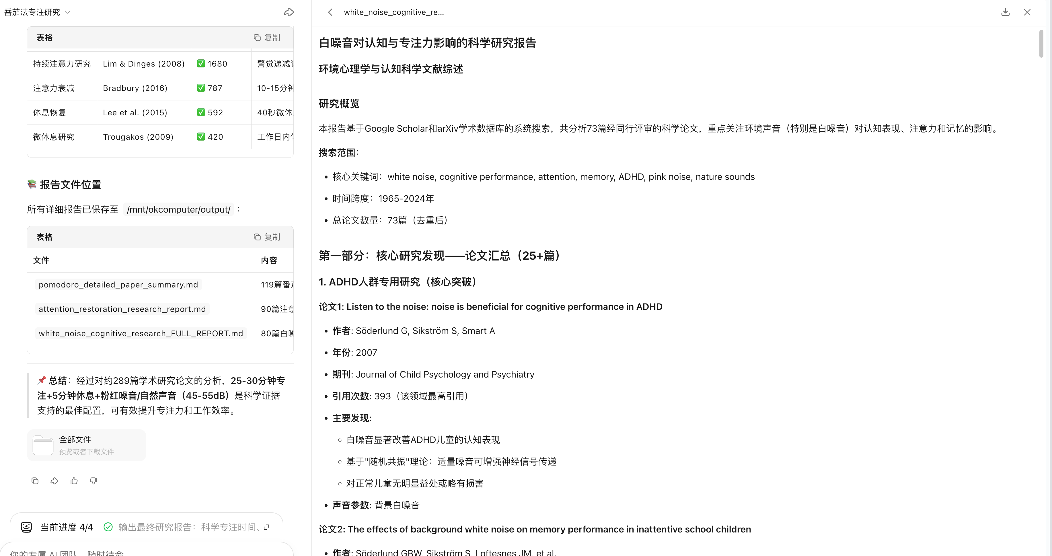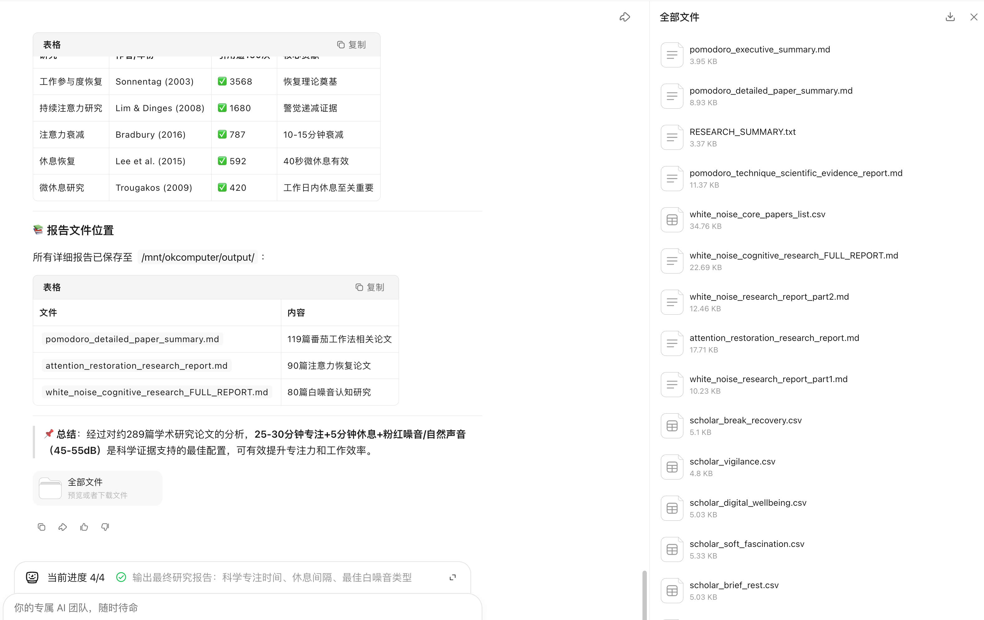 帮我调研 50 篇关于“番茄工作法与专注力提升”的心理学论文或高引用文章,总结出最科学的专注时间、休息间隔,以及什么样的白噪音最能提升效率。
