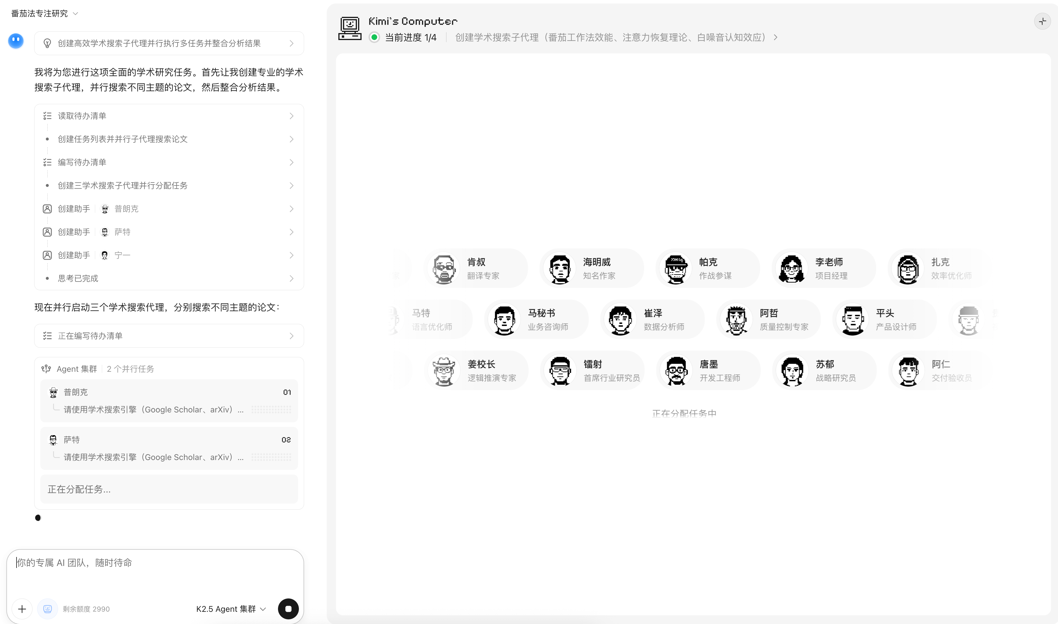 在 Kimi 的任务管理器里,瞬间爆出了几个子任务,这就好比你手下多了几个实习生,每个人领了几篇论文去读。
