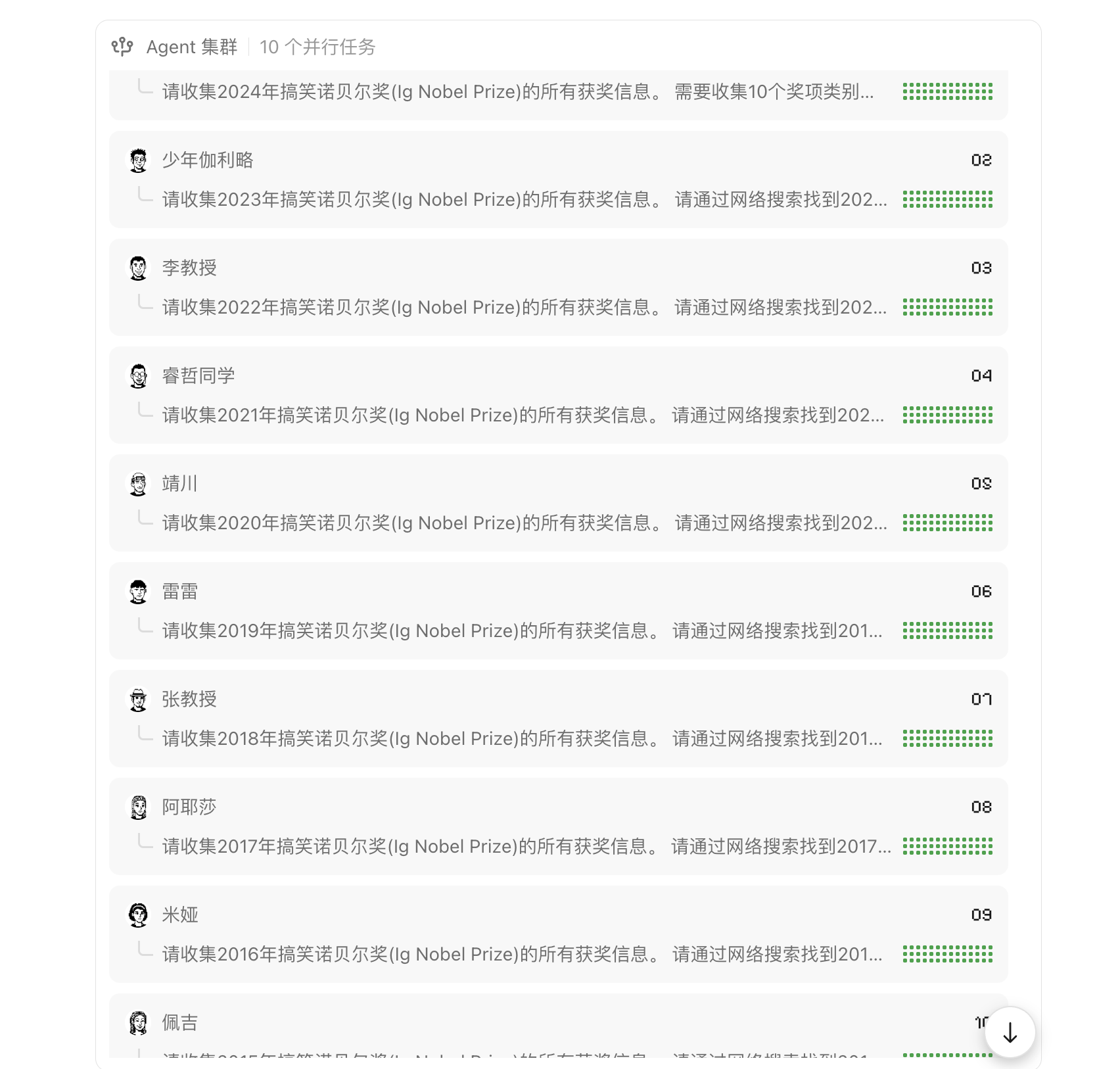 整个过程大约持续了8分钟,我看到它分配了10个Agent,然后每个人分别去查一年的资料,最后刷刷刷给我列出了一个表格!