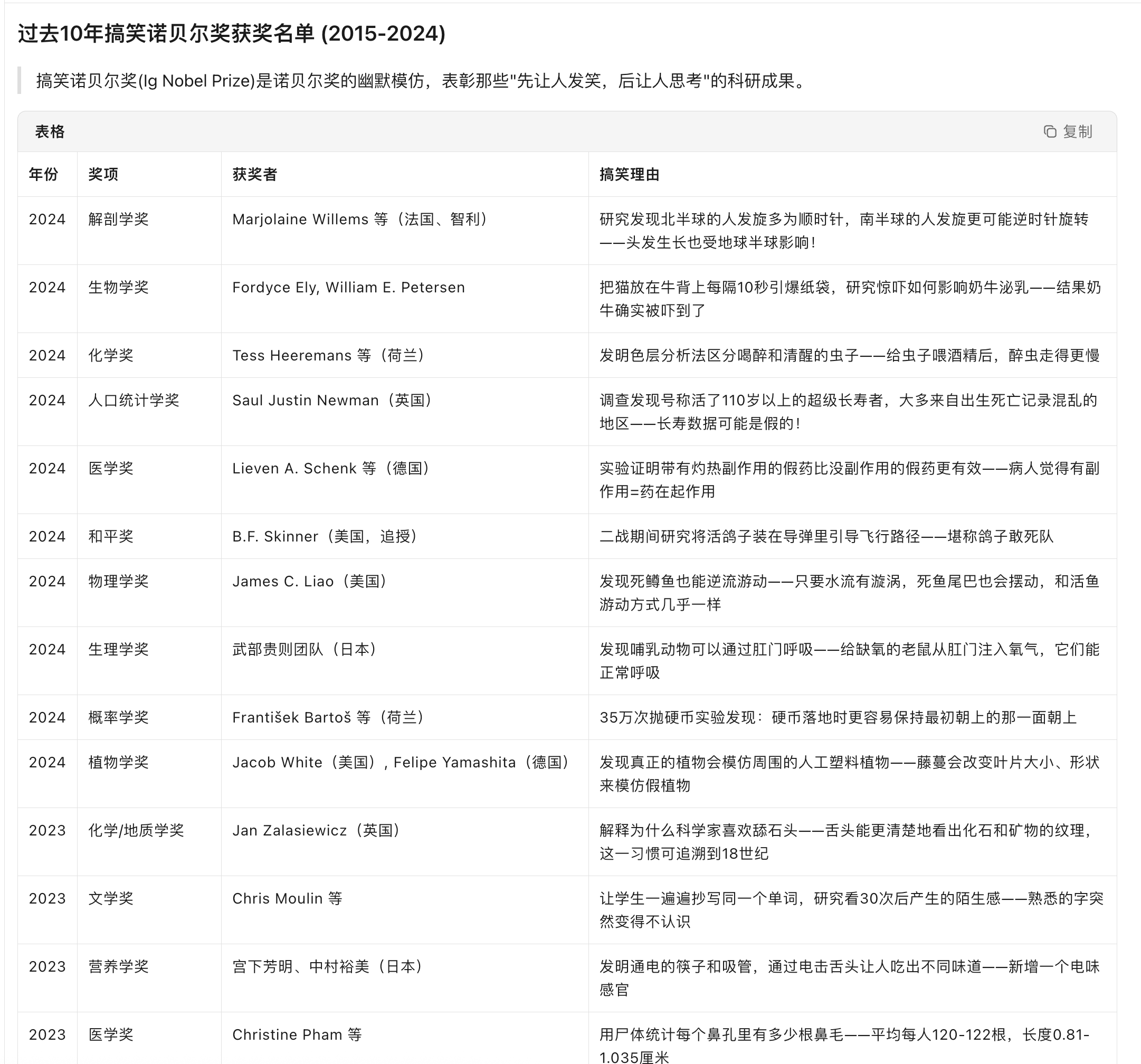 帮我批量调研过去 10 年最奇葩的“搞笑诺贝尔奖”(Ig Nobel Prize),生成一个 Markdown 表格,列出年份、奖项、获奖者和搞笑理由。